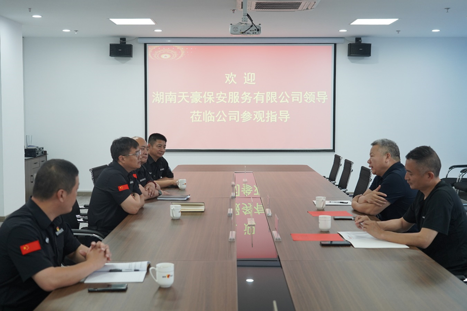 5月27日,湖南天豪保安服務(wù)有限公司董事長(zhǎng)趙士友、總經(jīng)理吳燦光蒞臨我公司交流工作,公司黨委書記、董事長(zhǎng)付志欣,黨委委員、副總經(jīng)理丁德鵬,黨委委員、副總經(jīng)理王成,辦公室主任范丙磊陪同。